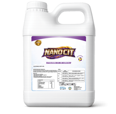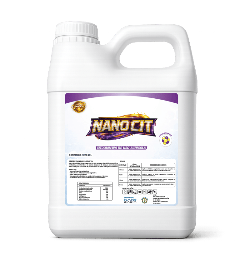 NANO CIT es un producto PREMIUM formulado con una combinación balanceada y sinérgica de citoquininas, giberelinas, auxinas, vitaminas y cofactores metabólicos, diseñado para activar y potenciar los procesos fisiológicos clave de las plantas. Su acción integral estimula la división y elongación celular, mejora el establecimiento floral, favorece el desarrollo radicular y optimiza el llenado, tamaño y peso de frutos.
