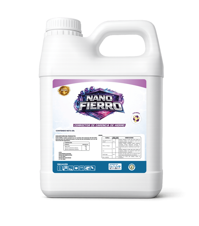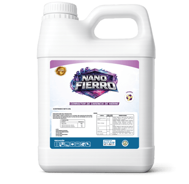 NANO FIERRO, nuestro producto es un corrector de carencias de Hierro(Fe), este elemento es importante para muchas de las actividades como en las reacciones de respiración. Desempeña funciones claves en la síntesis de clorofila, mantiene la estructura de los cloroplastos y la actividad enzimática.