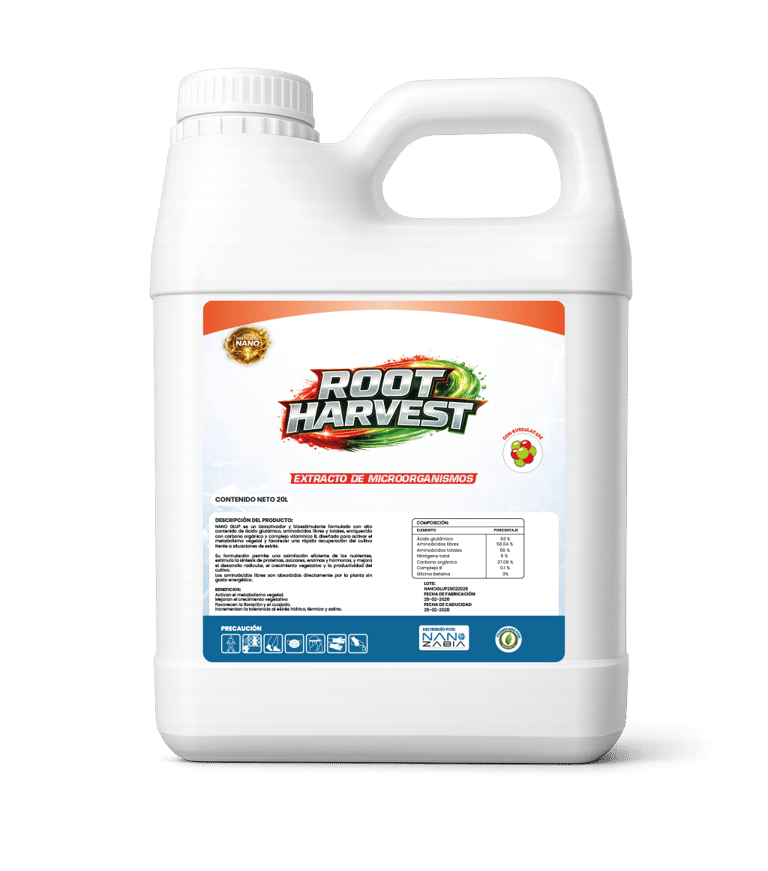 ROOT HARVEST es un producto hidrosoluble a base de microorganismos benéficos, desarrollado en un medio líquido, estable a temperatura ambiente y formulado para su aplicación directa al suelo. La aplicación de ROOT HARVEST estimula el desarrollo radicular y mejora la eficiencia en la absorción de nutrientes, lo que se refleja en un mayor vigor vegetal, un crecimiento equilibrado de las plantas y una mejora en la calidad y vida pos cosecha del producto final. Asimismo, su uso contribuye a la revitalización de suelos empobrecidos, promoviendo la actividad biológica del suelo y mejorando las condiciones físicas, químicas y biológicas necesarias para un óptimo desarrollo de los cultivos.