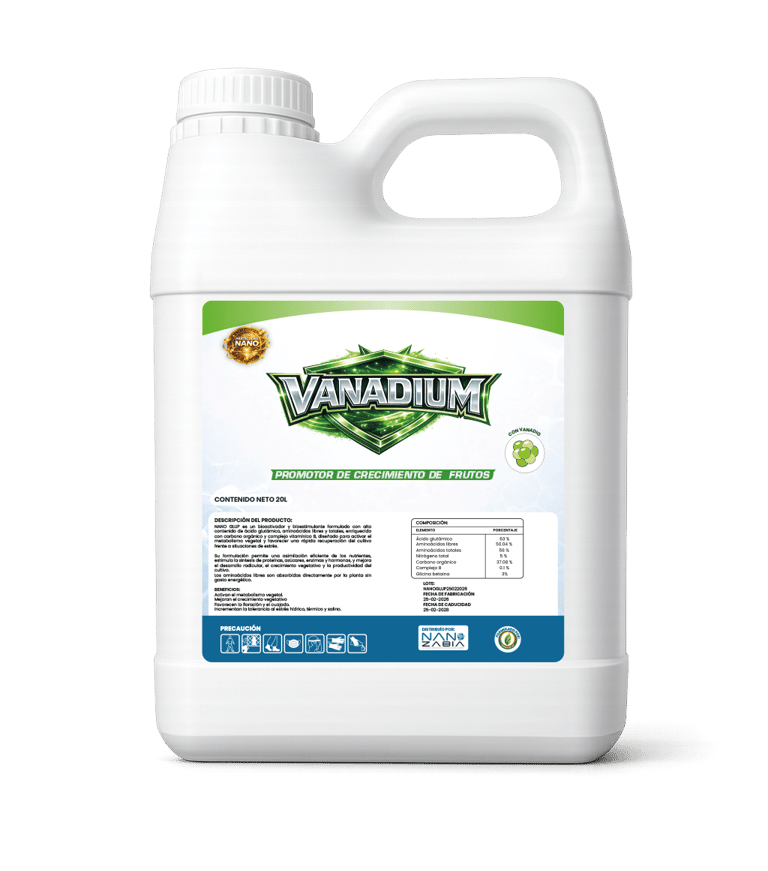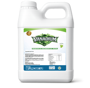 Es un fertilizante en particulas nano, compuesto por elementos escenciales y elementos beneficios como es el Vanadio: Influye en la actividad de las fosfatasas y la síntesis de la clorofila aumentando directamente la disponibilidad de energía en el fruto y sosténiendo un crecimiento adecuado. El uso de Vanadio optimiza el metabolismo de nitrógeno, a nivel de fruto esto se traduce en un suministro constante de proteínas dando como resultado un mejor llenado.